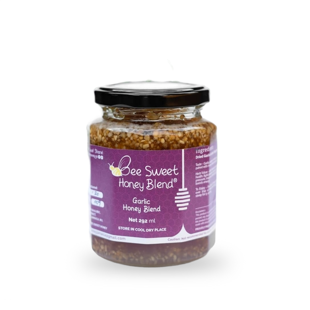 Garlic Honey – garlic improves immune health, fight infections, improves high blood pressure, improves cholesterol levels, and boosts energy. The Taste is pungent with a mellow spicy taste.